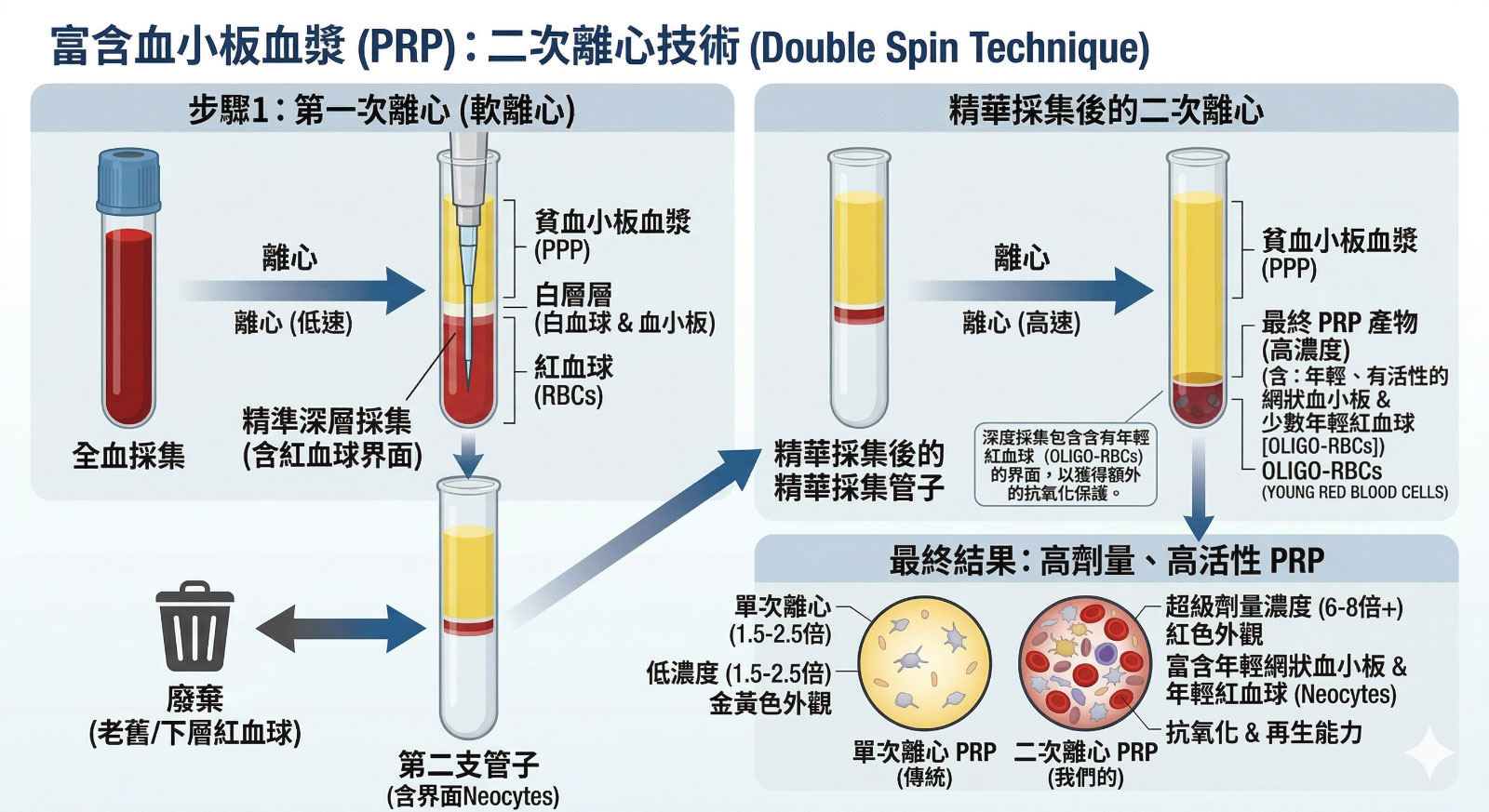 - 拒絕老舊細胞: 二次離心能過濾掉會引發發炎的老舊紅血球,只留下有幫助的成分。